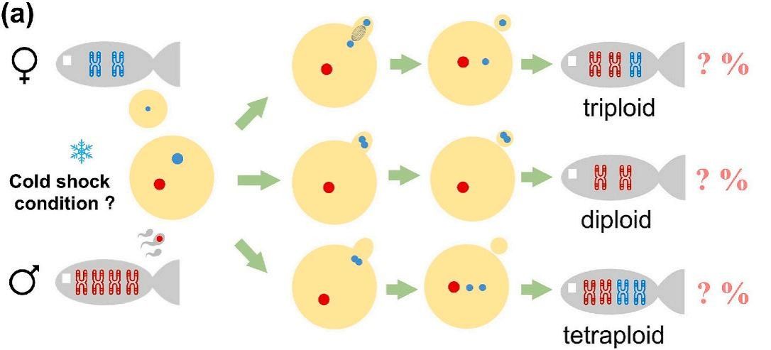 Androgenesis or polyploidization The ploidy induction trend of different meiotic cold shock conditions in red crucian carp (2n, ♀) × tetraploid carp (4n, ♂) |